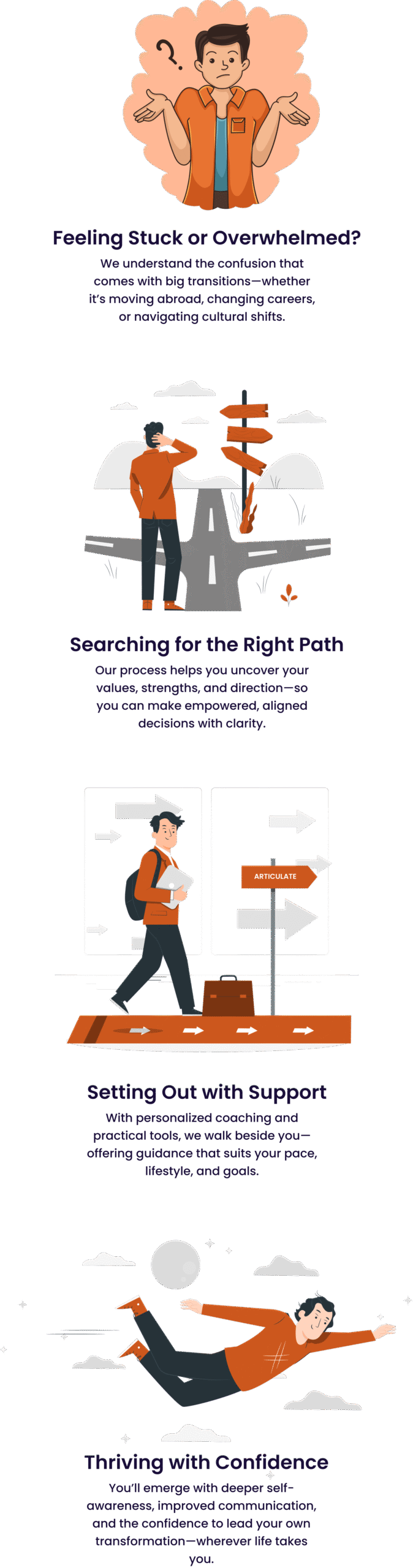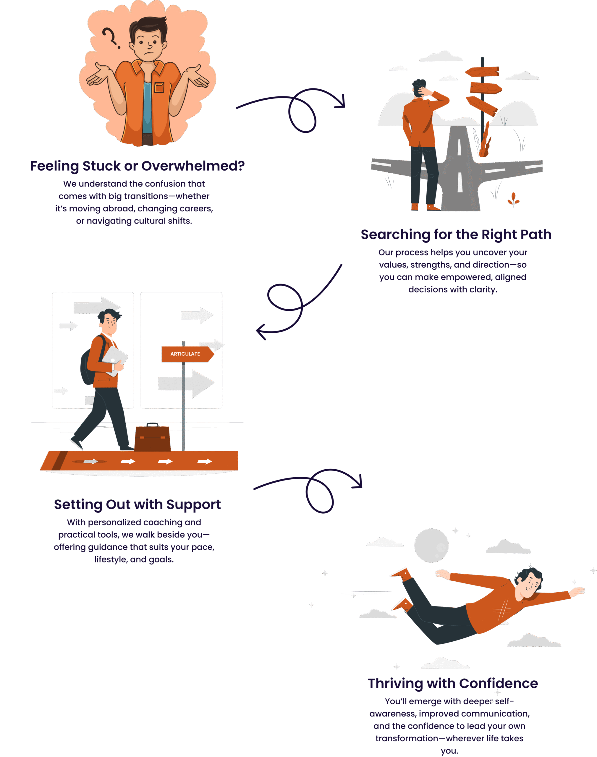 Support tailored to your unique journey—whether you’re navigating cultural shifts, building confidence, or restarting life in a new country.